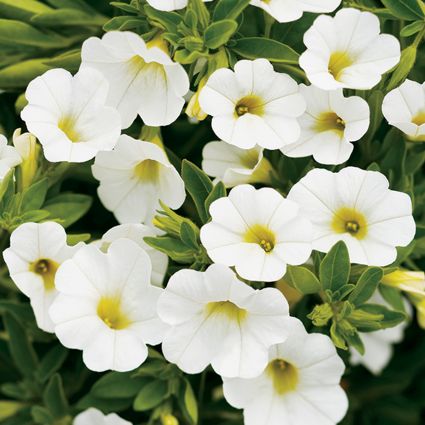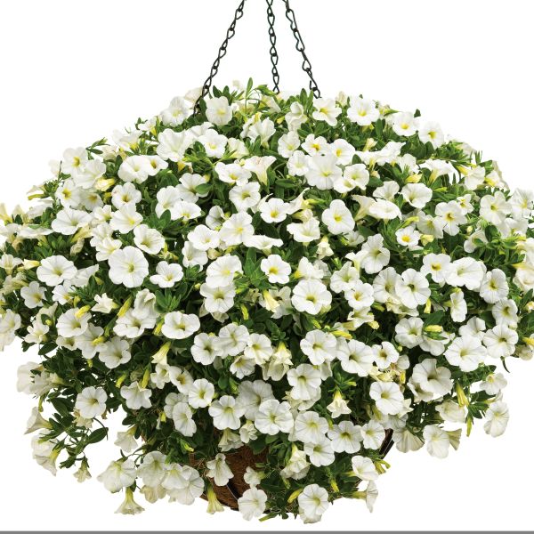 This vigorous fast growing plant produces hundreds of vividly colored white flowers that bloom from spring until first frost. Calibrachoa Superbells are easy to grow. Place them in full sun, shade will severely limit the number of flowers.